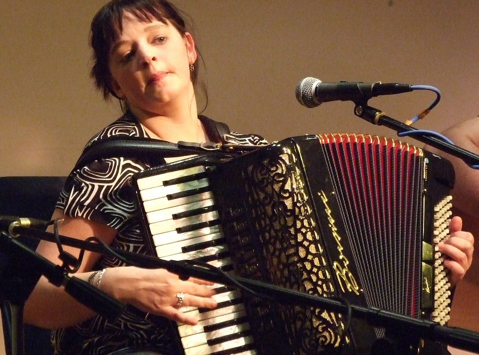 In case you were wondering, Lyra Celtica is not a brand of indigenous Scottish sportswear, but a vehicle for the virtuoso accordion playing of one time BBC Young Traditional Musician of the Year, Lynn Tocker. Accompanied by Frankie McGuire on a variety of percussion and whistles and Mark Canning on guitar, Lynn showed her credentials as a brilliant piano accordion player throughout two superb sets tonight at the Monday Music Club. As something of a wannabe guitar player myself, I could just about see what Mark was doing, albeit that bit faster than I can manage, and as a child, equipped with mums knitting needles and the arm of the sofa, I had a good idea what drumming was all about, but the piano accordion to me is a total enigma. I had no idea tonight what Lynn was doing, but it sounded good. Lynn cut her teeth on the instrument from the tender age of nine and worked with a whole bunch of extraordinary musicians in her home of Northumberland. Being exposed to the likes of Willie Taylor, Joe Hutton and Will Atkinson, as well as being a member of Kathryn Tickell’s band did no harm for the young musician, nor did her triumph in 1987 when she won her prestigious BBC award. Tonight the trio were on good form and played two excellent sets to a small and quiet but appreciative audience. Bare footed, Lynn switched from dazzlingly raucous jigs and reels (Scottish, Irish and French Canadian or somewhere closer to home) to emotive and tender ballads, during which she lovingly laid her head upon her instrument, in a gesture of complete tenderness. “Floating from Skerry”, a beautiful composition with a beautiful title, comes from the less than beautiful experience of a fifteen year old’s boat trip to Shetland with a stinking hangover, such is the manner in which tunes come to the head of Lynn Tocker. Frankie McGuire drives the sound along alternating between bodhran, bongos and jembe, as well as providing sensitive low whistle and penny whistle accompaniment. I was looking at all the strange percussion instruments at Frankie’s feet and noticed one that looked remarkably like a screwdriver. I was looking forward to hearing what sound it made, only to discover later, that it was indeed just a screwdriver, presumably for tweaking the drums! Frankie is also a fine singer of ballads and The Queen of Argyle was one of the highlights of the set. The band also premiered a new song called “When I Go”, with its potent Native American imagery. I wasn’t expecting to enjoy this band as much as I did. The years of listening to instrumental Celtic music from the Bothy Band, Planxty, Moving Hearts, Clannad, Capercaillie and an endless list of pretenders may have taken its toll on my sensibilities, but up close and very definitely live, who could not enjoy it, really?