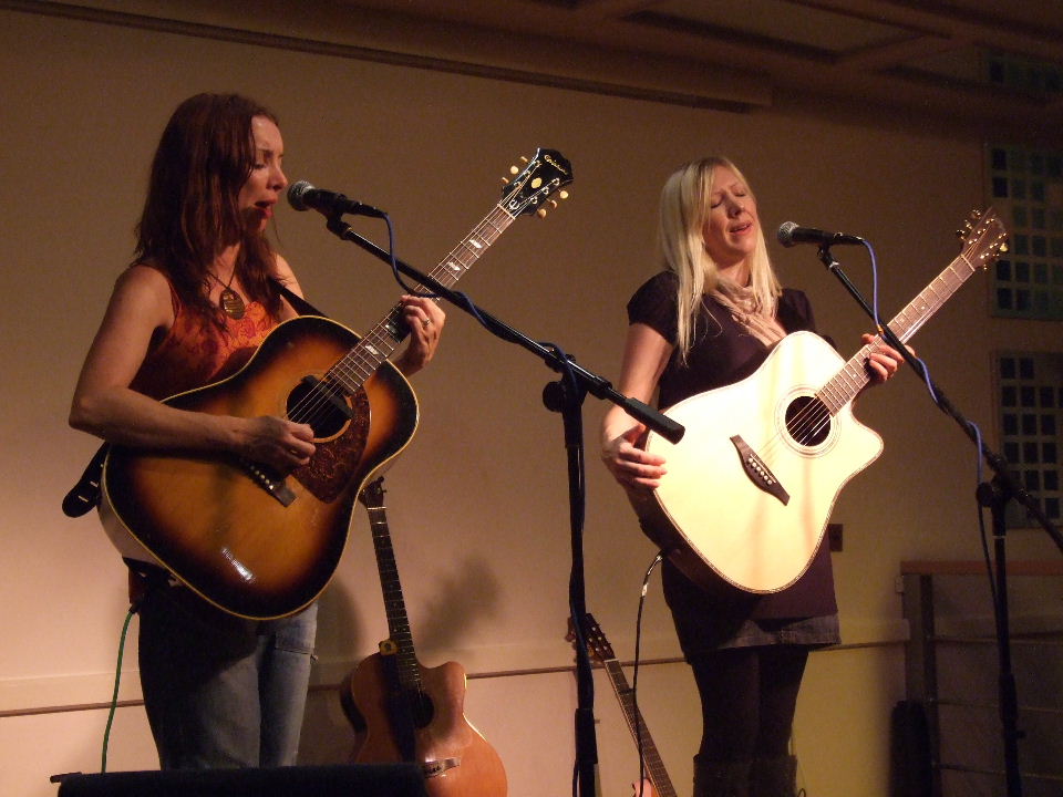 It would probably be impolite to describe here just how scared Crosby Stills and Nash were when they took to the Woodstock stage way back in ‘69 for their supposed second gig ever but last night for their third gig ever, Becky Mills and Patsy Matheson seemed relatively relaxed when they appeared at the Monday Music Club at the Regent as a duo. This could possibly have something to do with the slight difference in numbers, granted, but in both cases, cutting your teeth in high profile bands appears to bring out an assured confidence in an artist or in this case, two artists. On this occasion, Becky and Patsy have temporarily strayed from fellow bandmates Rachel Goodwin and Jools Parker to bring to this small Doncaster audience the essence of Waking the Witch in a stripped down version. What Waking the Witch do share with the aformentioned Sixties ‘supergroup’ is a flare for vocal dexterity that is best captured live. Fortunately, very little is lost in the singing of Becky and Patsy, both of whom possess distinctly different voices that somehow work together incredibly well. From the outset, I wondered whether the ‘missing’ voices would be so noticable as to signify a gaping hole, but pleasantly surprised was I. Taking selections from each of the bands’ three albums, the duo managed to deliver each song without losing any of the power of the four piece on songs such as “Only Human” with some sweet slide guitar, the outstanding “Jenny Thornton & The Boys from the Abattoir” with it’s cute whistled coda filling in for the brass section used on the recorded version, “There for Me” the usual Waking The Witch opener and “Spring Song” with its creative use of a South American rainstick. And then, as if this wasn’t enough, along comes the touching “Man of Moon”, Becky Mills’ achingly personal song which invites us all to witness first hand emotional turmoil in song. The haunting coda of “rewind, pause, play” seems to stay with you. Once heard, never forgotten. The three cover versions of the night could not have been culled from more diverse sources; “Gold Watch Blues”, a Donovan cover written by Mick Softley with its interesting jews harp accompaniament, tells the all too familiar tale of signing away ones being to a life of work; the traditional power ballad that is and always will be “Matty Groves” with all the ‘umph’ of, let’s say your common or garden British folk rock outfit; and of all things, Gary Numan’s “Cars”. I guess you really had to be there to witness it, but if this isn’t too much of a stretch, imagine “Cars” as appearing on Joni Mitchell’s first album and fitting seamlessly between “Night in the City” and “Marcie” – I know, difficult to imagine but true. Musical trinkets such as the Bolivian rainstick, an assortment of shakers and rattlers, the odd jews harp, a couple of nice guitars and a mandolin are all delightfully utilised in this duos’ set, but when it comes down to it, it’s those voices that matter, that’s what it’s all about. Becky Mills and Patsy Matheson make it all seem as easy as breathing and I suspect to them, this is precisely what it is.