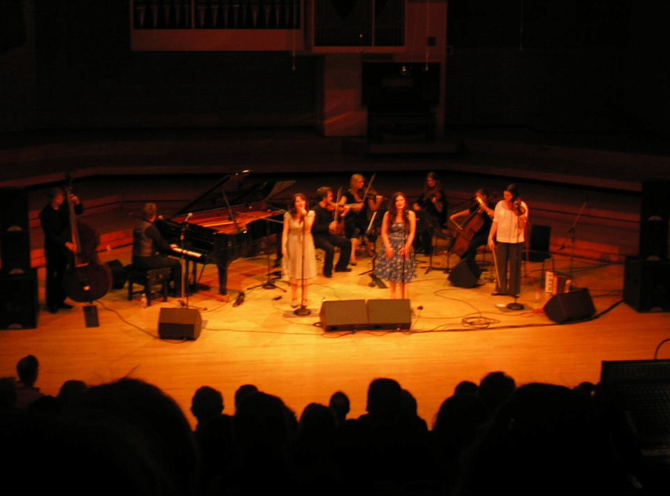 Another excellent Winterset concert tonight, this time at the Royal Northern College of Music in Manchester, where the Unthanks managed to coerce a string quartet and a double bassist from the college into the act. That’s the thing about classical musicians, plonk some dots in front of them and they’re off, no egos, no painfully emotive soloing, it’s just good old fashioned musical arrangement. I wanted a night off from all the note taking, so I just relaxed, took a seat at the back, behind Adrian (you can’t really choose a better place to see a gig than right there near the sound desk), put my feet up and enjoyed. I didn’t bother taking my camera, although luckily, I had the good sense to keep in my pocket my old faithful digicam, which came in handy for a couple of after show shots in the bar. The real reason I chose to swap Leeds (tomorrow) for Manchester (tonight), was specifically to catch Devon Sproule once again before she returns to the States on Tuesday. This was a fortunate decision because I also got to see her with her husband Paul Curreri, who duetted with her at the end of her set, which was one of the most touching moments I have witnessed on stage.