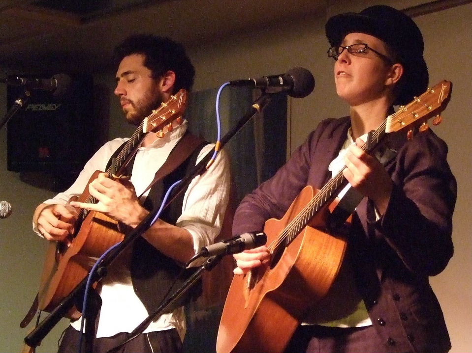 When Kirsty McGee and Mat Martin are on tour, they mean business. The pile of assorted instrument cases by the stage at the Monday Music Club at the Regent in Doncaster tonight resembled that famous ‘pile of suitcases’ sculpture on Hope Street in Liverpool. With a variety of stringed instruments from the banjo, ukulele and mandolin families, all stacked neatly on their respective racks, the duo were ready to play gig sixteen of their current twenty-five date UK tour. The duo fully intended to play two sets tonight, presumably utilising each and every one of these weird and wonderful instruments and armed with a set list that covered the best songs from all of Kirsty’s recorded output, which now runs to three full albums no less and a couple of EPs. Sadly this wasn’t to be. Kirsty has been suffering from a dreaded cold recently and tonight in Doncaster, her voice finally disappeared towards the end of the duo’s first set, despite vigorous efforts to fight it off. It was not only pointless to go on, it had the potential of causing unnecessary damage to Kirsty’s voice. Despite the premature end to the duo’s concert tonight, the nine-song set they did manage to get through was certainly worthy of a few words. It was just long enough to be considered ‘festival-length’ after all. In keeping with the vaudevillian theme of their current tour posters and hand bills, the duo appeared on stage looking very much the part. You get the distinct impression of either American vaudeville or Old English music hall. I loved the quote in Maverick magazine who described them as the Tim Burton version of Simon and Garfunkel. Whatever period in history the duo choose to adopt in order to feel comfortable on stage, one thing cannot be changed or contrived and that is the sound of Kirsty’s voice and the manner in which the duo arrange their songs. They have an instantly recognisable sound and their delicate arrangements and multi-instrumental accompaniment forms a perfect backdrop to Kirsty’s unique voice. Even though the concert was reduced to just the one set, the duo managed to perform material from each of their three albums and a couple from the new Hobopop EP, which they are promoting on this tour. Opening with “Lamb” a new song with a distinctively Appalachian feel, courtesy of Mat Martin’s frailing banjo accompaniment, revealed to anyone used to Kirsty’s voice some sign of frailty. Anyone who was in the audience experiencing Kirsty for the first time wouldn’t have noticed I’ll bet. “The Profit Song” and “Killer Wasps” provided some jaunty rhythms which are fast becoming the duo’s trademark, the latter reminiscent of the Hot Club of France, with its Djangoesque guitar accompaniment played beautifully by Mat Martin. Of the older songs, “Bliss” from Kirsty’s 2002 debut Honeysuckle has been resurrected after requests from the audiences they’ve been playing to this year and the popular “Coffee Coloured Strings” and “Plane Vapours” from the second album Frost. Kirsty performed three songs from her latest album Two Birds, “One Star”, “Thank You” and “Freshwater”, with it’s desperately bleak chorus of ‘the body knows nothing till the soul cries out, the soul knows nothing till the body burns’, before realising that her soul was crying out for her to stop singing and rest up before it indeed burned out! Kirsty and Mat gave each member of the audience a copy of the Hobopop EP as a gesture of goodwill and as compensation for the shortened set, although in reality, the evening was still very much a success. With a bit of re-shuffling, Bob Chiswick opted for the traditional ‘show must go on’ avenue by inviting some friends to step in. So with an impromptu set from regular support John Law and another set by the visiting support duo James Meadows and Steve Lacey, who had incidentally kicked off the night, the audience hopefully went away having had another good night at the Regent.