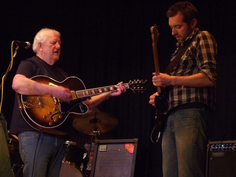 Originally organised by drummer/photographer Bryan Ledgard, this benefit concert for the late jazz guitarist Diz Disley came at a confusing time. When the news broke that Disley was extremely poorly, friends such as Dave Swarbrick rallied around in aid of the ailing musician and tonight’s concert was thought of as South Yorkshire’s helping contribution. Since organising the concert though, Diz sadly passed away on March 22 and it’s quite possible that those who pledged their support were unaware that the concert was still going to go ahead as planned. Swarb had pretty much organised and paid for Disley’s funeral and it seemed only right to see that the concert went ahead to ensure everyone’s endeavours would help in some small way to ease the expense burden of this unexpected and shocking end to one of the countries much loved characters. In the spirit of a memorial concert, Shagpile’s appearance at The Rock in Maltby did go ahead despite the poor turn out and Dave Burland and Co provided a couple of hours of classic rock and roll; the three minute variety that makes the hairs stand on end. The band, made up of guitarist/singer Dave Burland, sporting his legendary sunburst Gibson, Dave Fisher on keyboards, Bryan Ledgard on drums, Chris Baty on lead guitar and Robin Garside standing in at short notice on bass, took to the stage at the Rock and gave those of us who could attend a memorable night of nostalgia and fun. I guess it’s hard to feel cheerful when we lose our friends but tonight’s concert was taken in the spirit of a Wake and all the classics rolled out one after the other, with the two Daves (Burland and Fisher) alternating between the Chuck Berrys and Little Richards and the Fats Dominoes and the Jerry Lees with a whole lotta shaking going on in between. In all fairness the shaking was kept to a minimum due to doctor’s orders. “That’s done me blood pressure no good at all” Burland quipped at the end of “I Hear You Knocking”. Peppered with Diz Disley anecdotes and assorted memories, the concert featured the likes of “Long Tall Sally”, “High Heel Sneakers”, “Staggerlee”, “See You Later Alligator”, “Flip Flop and Fly”, “Great Balls of Fire”, “Mystery Train” and “Teddy Bear” to name but a few. Probably the most contemporary song of the night came in the form of the classic Little Feat number “Dixie Chicken”, which re-visited that band’s classic Waiting For Columbus take on the song. I was just willin’ the band to go straight into “Tripe Face Boogie”. Dave Burland declared at the end of the night that the gig would’ve tickled Diz. I’m absolutely certain it would. I look forward to seeing Shagpile again in happier times and with a slightly larger audience.