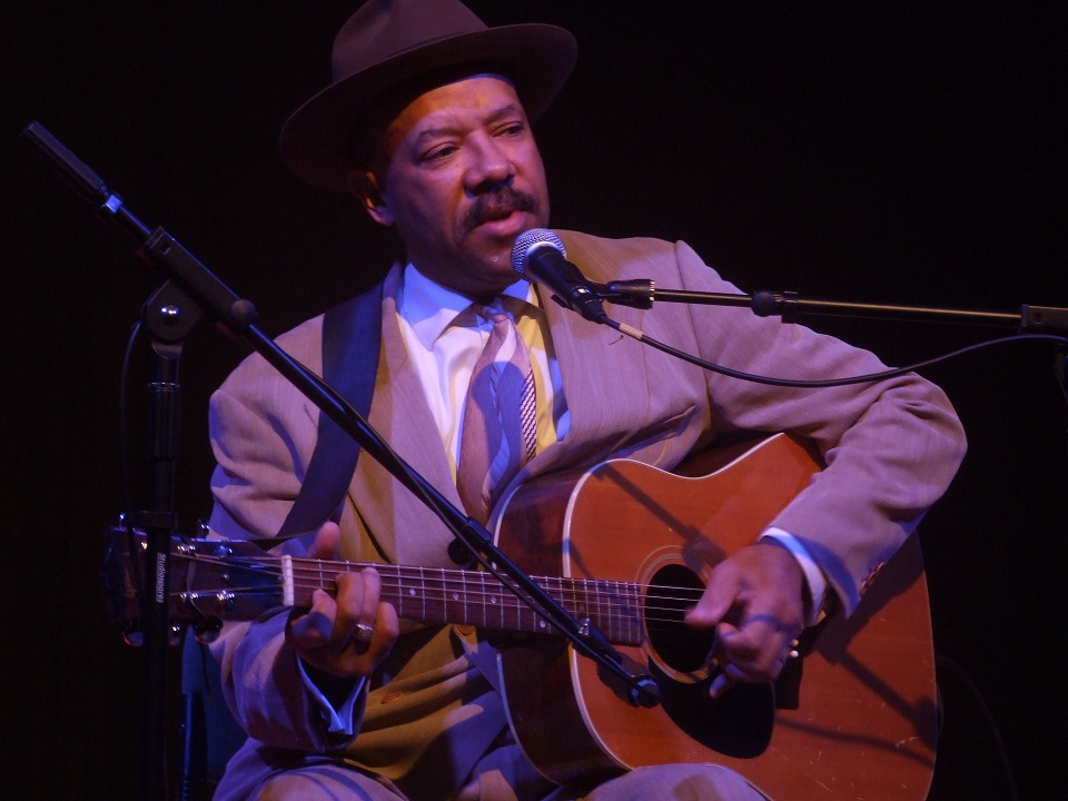 Washington DC born ‘songster’ Michael Roach made a return visit to the Selby Town Hall tonight for a couple of sets consisting of a broad range of songs that included several blues standards, a handful of gospel and spiritual songs, a few from Roach’s own pen and one or two nursery rhymes. Smartly suited and wearing his trademark brown fedora, the seated musician alternated between his Gibson acoustic and prized National Steel, for an evening of songs predominantly from his current album release Innocent Child. Easing the audience into his opening set with four songs from the new album, Mississippi John Hurt’s “Got the Blues and Can’t Be Satisfied”, “Be a Man”, “What’s the Matter Blues” and “Noah”, the singer’s warmth and relaxed manner soon became apparent. With an almost encyclopaedic knowledge of African/American music and culture, Roach went on to insist that he is no Bluesman, rather a Songster. He also contested his status as an academic, preferring to be acknowledged as just an ordinary fellah with an insatiable curiosity. As is the case of many songsters and bluesmen in the evolving traditions of American folk music, Roach learned a good deal from his elders and in his own particular case, Archie Edwards, John Jackson, John Cephas and Jerry Ricks, all now sadly passed, but with their legacy very much living on in Michael Roach’s music. Speaking highly of John Cephas in particular, both as a major influence, teacher and friend, Roach went on to pay tribute to him with a heartfelt performance of “Remember Me”, Roach’s composite arrangement of the Swan Silvertones’ “That Cross on Calvary” and the Harmonising Four’s “When Tears are Falling”. With some enlightening historical anecdotes between songs, Roach dispelled some of the myths surrounding the story of the blues, such as the incorrect notion that the blues began in Africa or indeed in the Mississippi Delta, using simple chronological historical records. Roach also attempted to demonstrate how some of our modern musical styles derived such as in the case of Bo Diddley, who’s style of playing Roach believes comes directly from the art of ‘hand bone’, the rhythmic slapping of hands on thighs, chest, chops and anywhere else that takes your fancy. For those in the audience who had come along to hear some real down home blues, they wouldn’t have been disappointed with Roach’s performances of such classics as Sleepy John Estes’ “Brownsville Blues”, Willie Dixon’s “Little Red Rooster”, both incorporating the bottleneck style and resonator guitar, together with a faithful version of Son House’s “Death Letter”. Reminiscent at times of Big Bill Broonzy, Roach paid tribute to his fellow ‘Songster’ with “A Shanty in Old Shanty Town” and the suggestive “How Do You Want It Done?”, both very much a part of the American folk tradition. Consistent with Roach’s claim to be a Songster, rather than a Bluesman, the singer went on to perform in a variety of styles such as in the folk blues of “Staggerlee” and “Kassie Jones”, the country blues of Hawkshaw Hawkins’ “Rattlesnakin’ Daddy”, the jazz inflected “Minnie the Moocher”, the spirituals “Swing Low Sweet Chariot” and “Jesus Knows I’m Coming” and even a bunch of nursery rhymes with the audience offering suggestions as Michael proved that every one of them fit snuggly into the same blues tune with an infectious chorus of “Little Boy Blue”. Finishing with a version of the old American folk song “I Shall Not Be Moved” and a final a cappella version of Mahalia Jackson’s “It Don’t Cost Very Much”, Michael Roach left the stage, once again leaving behind a suitably satisfied Selby audience.