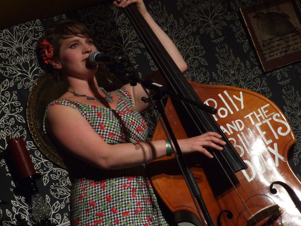 Having feasted upon Miss Quincy’s current album Your Mama Don’t Like Me over the winter months, a thought occurred to me; how will a stripped down version of these songs go down at the Wheelhouse? Pretty well it transpires. Miss Quincy is quoted to have said, when referring to the home-made approach she applied to her album, which was recorded in a similar log cabin up in British Columbia during the hostile winter of 2009/2010, that if you listen carefully you can hear ‘the crackling of a wood stove or the swish of a whiskey bottle’. It was that sort of feeling that came over tonight at the Wheelhouse in Wombwell. Miss Quincy is the alter-ego of Canadian singer-songwriter Jody Peck, who when suitably attired in cowboy boots and trilby hat, sporting a bright red flower and matching lippy, to go with the ever present and intriguing full forearm tattoo, brings the character of one of her songs to life. “The Ballad of Miss Quincy” appeared on her first album Miss Quincy and the Ramblers and has subsequently become the singer-songwriter’s charismatic character. Starting with a new song “Northern Sky”, the title of which derives from the name of this very website I’m flattered to say, Miss Quincy and guitar/banjo maestro Tyler ‘Lefty’ Toews, went on to showcase a couple of sets of songs, largely made up with songs from the new album with a handful of others thrown in. Alternating between acoustic and electric guitars, apparently chosen randomly as the mood suited, both musicians were characteristically in tune with both one another and the audience alike in no time flat. “Carmen”, also from the first album, provided the sort of chorus that invited an enthusiastic audience response without too much trouble. The great blues women of the 1930s feature quite liberally in Miss Quincy’s set, both in terms of homage, with her self-penned “Sing Lady”, dedicated to the first queen of the blues Ma Rainey and the inclusion of the odd blues cover, Memphis Minnie’s “Bad Luck Woman” for example, featuring Miss Quincy’s bluesy harmonica playing. For the sheer passion in Miss Quincy’s inimitable voice there was no finer moment than when forty pairs of ears awaited the sound of a pin to drop during the astonishingly beautiful “Record Store”, which closed the first set. The reference in that song to Hank Williams was echoed during the second set, when the duo performed one of the country legend’s most memorable songs, “I’m So Lonesome I Could Cry”. Both musicians brought to Wombwell a sense of fun, the kind of banter that can only be honed from the experience of the road, a road that Miss Quincy is no stranger to. Some of the characters Miss Quincy meets on that road inevitably find their way into some of her songs and also in the stories she likes to tell in between those songs. Coming from a cowboy family, Miss Quincy reminded us that dragging a dead horse around is a difficult business, especially when used as a simile for being involved with ‘married men and whiskey’. Using the Wheelhouse stage as a stomp box, Miss Quincy delivered a stunning version of “Dead Horse”, catching the audience off guard with one of those ‘the song’s not quite finished yet’ moments. Other songs from the new album included the show stopping “Nobody With You” coupled with “Sweet Jesus Café” as well as a fine reading of the traditional “Poor Wayfaring Stranger” with Tyler’s syncopated banjo accompaniment. In “Silent Movie”, we are invited to ‘go there’ with Miss Quincy, which we obligingly and quite willingly do, joining her on the tracks as Buster Keaton’s runaway train approaches, to the proverbial drama of the piano accompaniment, or on this occasion, deputised by a couple of guitars. Returning to the stage for a final encore of Nina Simone’s “Sugar in My Bowl”, Miss Quincy dispelled all my initial fears that I might not engage with her live music as freely as I did her album. How wrong; it was on equal par if not better.