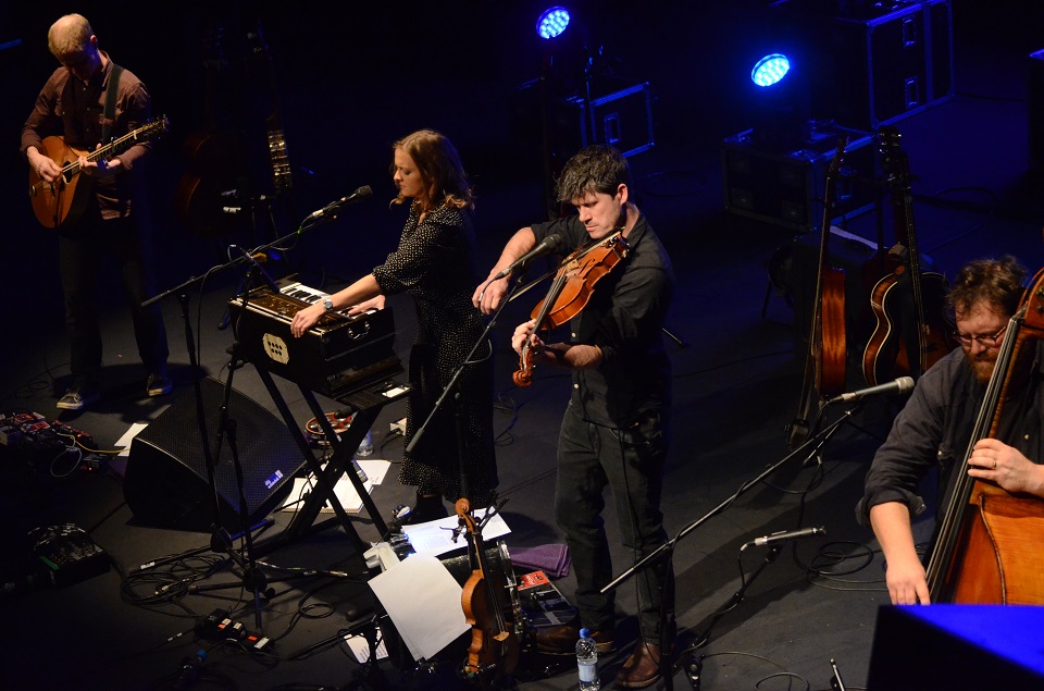 For the launch of his new album, A Pilgrim’s Tale, Seth Lakeman has chosen ten venues in locations very much associated with the Mayflower, starting in Doncaster, just twelve miles north of Scrooby, the birthplace of William Brewster, one of the Pilgrim Fathers who, with his family, sailed on the vessel four centuries ago. With a keen interest in the subject, the Dartmoor singer and musician has approached the 400th anniversary of this event by absorbing some of the available texts from this notable part of our history, even visiting and meeting the Wampanoag people of the Plymouth Plantation in Massachusetts whilst on tour with Robert Plant, which is really where the inspiration for this project derives. Tonight at the CAST theatre, Seth Lakeman and three musical collaborators, Benji Kirkpatrick, Ben Nicholls and Alex Hart, performed the album in its entirety, complete with Nick Stimson’s recorded narration, read by actor Paul McGann, with no further spoken dialogue necessary. Earlier in the sound check Seth pondered “Do you think the audience will applaud between each of the songs?” I don’t think there was ever any doubt of that happening really, with the narrative continuing as soon as the applause faded after each song. It worked considerably well, especially in view of the fact that this particular line-up had only been rehearsing together for two days prior to the event. For much of the production we are treated to Seth’s familiar stomping exuberance and energetic presence, yet one of the most memorable performances of the set was the tender duet with Alex Hart on “Bury Nights”, a moment to consider the hardships of the pilgrims and an admirable reflection of the album version that features Seth’s sister-in-law Cara Dillon. Both the narrative and the song performances kept the audience entranced throughout the performance , a combination of original songs, one or two traditional songs and some poetry set to music, along with the bold narration and period visual projections. The choreography of the piece remained uncluttered, with each of the musicians swapping instruments between performances; Seth alternating between fiddle and tenor guitar, Benji between bouzouki, guitar, banjo and side drum, Ben between upright bass and Jews Harp and Alex between harmonium and electric guitar, with little fuss. After a short break, Seth was eager to speak to the audience, heading immediately for the microphone with “Hello Doncaster, what a great theatre you have here”. He seemed almost relieved that he and his small band had managed to get through the debut performance of A Pilgrim’s Tale unscathed and was now ready to give the audience something they already knew, delighting Doncaster with such songs as “Bold Knight”, “The White Hare” and “Lady of the Sea” with its infectious rhythm and irresistible refrain Hear Her Calling, to which the audience was only too willing to respond to in fine voice. There was the one brand new song, the closest thing Seth is likely to get to Hillbilly, being flanked by the two Bens on both banjo and Jew’s Harp, before vacating the stage for Seth to perform his signature song “Kitty Jay” solo. With a stomping kick drum and fiddle of fire, Seth made those sixteen years since he first recorded the song seem like no more than five minutes. With the rest of the band returning to the stage, Seth and co concluded with “1643” from the Freedom Fields period and finally “Last Rider”, a fitting miner’s song to end another well organised, comfortable and entertaining evening at this fine theatre.