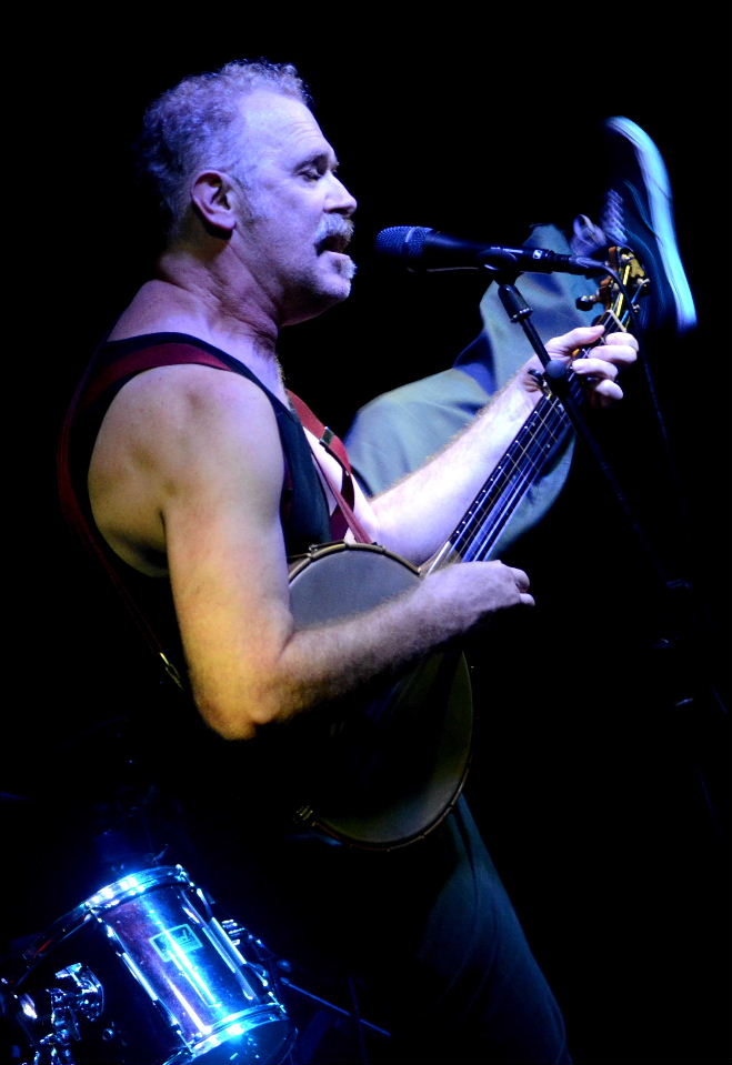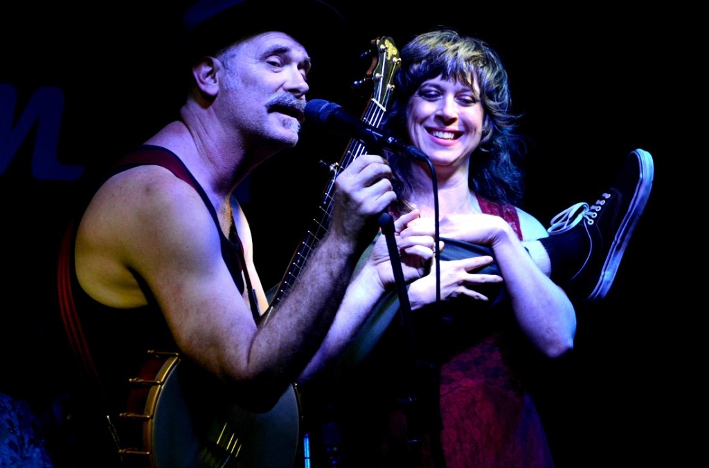 Though Pete hadn’t seen Curtis Eller or indeed his American Circus before, the musician’s reputation hadn’t passed my old friend by. He knew instinctively that he was in for a treat. Once Curtis took to the Backroom stage tonight at this noted Sheffield venue, all was immediately revealed as the performance began, with the banjo-totin’ song and dance man soon perching himself on a straight-backed chair, whilst encouraging the audience to do said pigeon impressions, with his usual confidence, panache and sense of occasion. Any doubts as to what this performer is all about immediately evaporates before our eyes and ears. Armed with his familiar battered banjo, Curtis manages to fill the stage, almost like an old vaudevillian novelty act, though any such notion should perhaps be left at the Big Top door (or flap, or whatever they call it). Reminiscent of a modern day Buster Keaton, Curtis dominates the Backroom stage even before the band comes out, which for this tour consists of singer/dancer and Bipeds co-founder Stacy Wolfson, bassist Hugh Crumley and drummer Andy Lyth. It’s difficult to take your eyes off Curtis for one single moment, as he embraces his banjo, delivering the occasional high kick at strategic points, though Stacy’s highly theatrical Stevie Nicks movements can at times be irresistible; at one point, the singer lying provocatively on the bar like Manet’s Olympia.