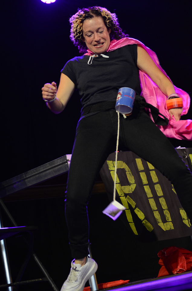 We don’t have to wait long before our aforementioned host arrives, specifically to treat us to perhaps the most memorable moment of the entire weekend, as our pink-caped heroine attempts to guide a soggy tea bag into a mug attached to her belt by means of physical agility and mental ingenuity. Beside her, the similarly attired Barnsley-born actor and old friend, Shaun Dooley, known for his TV, theatre and film work, most recently appearing in both Gentleman Jack and It’s a Sin, had already succeeded in the task a good couple of minutes before, receiving some appreciation from his fellow teammates and the audience alike. This fun spot in the programme has become a tradition at the festival, with memorable versions of This is Your Life and Family Fortunes already staged, with guest appearances by the likes of Ruth Jones, Dawn French and Jason Manford over the years. These fun events always make for an entertaining way of settling visitors into the swing of the weekend, while at the same time allowing our hosts the opportunity for a bit of cheesy fun before the serious business of running a festival gets underway.